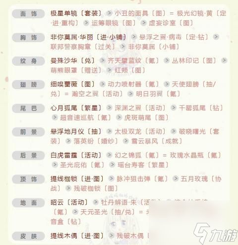 饰品·特殊顶配推荐:面饰极星单镜、胸饰非你莫属·华丽、纹身曼殊沙华、翅膀细嗅蔷薇、尾巴心月狐尾、前景悬浮地月仪、后景白虎雷霆、顶饰提线枷锁、地面昭云、皮肤提线木偶。
