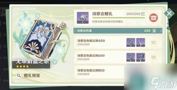 ● 完成各个玩法,可获得「诗歌会热度」。诗歌会热度达到指定值可以获得无垠蔚蓝之歌(活动绝版武器)、智识之冕、活动专属武器精炼材料等奖励。9mD