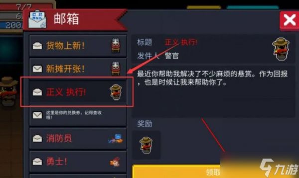 在大厅中邮箱中查看信件,找到警官发来的“正义执行”邮件,点击领取。