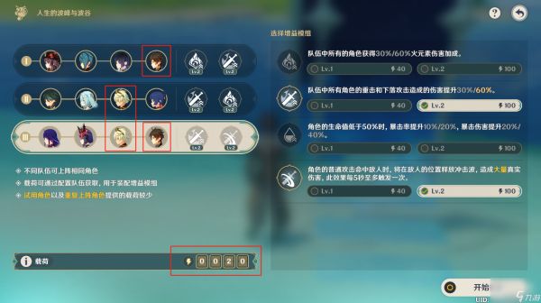 ● 每个挑战中,活动将提供2名试用角色;队伍中配置的自己的角色越多、角色等级越高,即可获得更多的「载荷」用以兑换并装配更高等级的「增益模组」。以全90级为例子,3队有2个角色相同,载荷能吃满增益。可以3队用同一队哈!