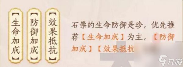 石崇具有很高的保护机制,适合作为辅助使用,石崇很适合给哪些爆发高,速度低而且皮很脆的名士作为辅助,适合多辅一。
