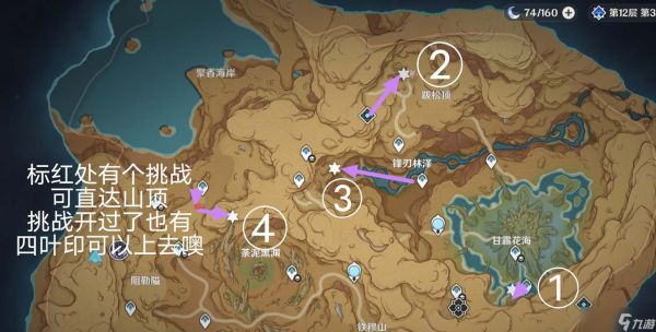 1、须弥碑铭的研究任务中需要收集4个碑文碎片,具体位置如下图所示:
