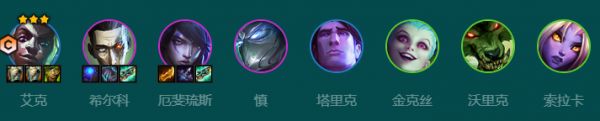 艾克、西尔科、厄斐琉斯、慎、塔里克、金克丝、沃里克、索拉卡