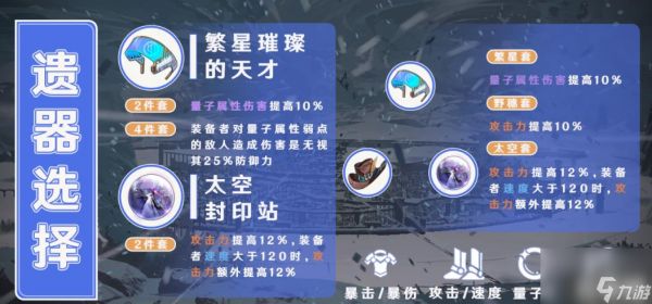4、希儿的遗器还可以选择繁星璀璨的天才、野穗伴行的快枪手和太空封印站的二加二加二组合作为过渡。中期过渡套装,也比较适合非量子队的后期套装。