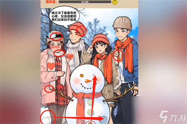 在爆梗找茬王冬日摄影这一关卡里,玩家需要找出其中不合理的地方使上方的满意度满,一共是12处不合理的地方,其中有两个相对隐藏的比较深,全部找出来即可。
