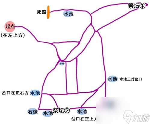 1.起点在右下方,根据出生地有水潭并向左上方出发来确认。