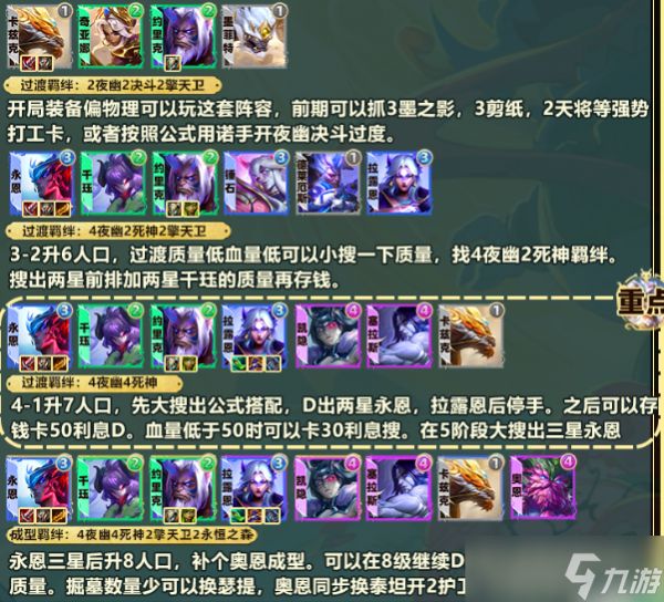 2、3-2升6人口,过渡质量低血量低可以小搜一下质量,找4夜幽2死神羁绊,搜出两星前排加两星干珏的质量再存钱。