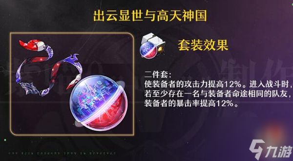 解析:提供了常驻的攻击力加成,所有的属性都是可以持续获得的,在队伍爆伤增益较多的情况下可以使用,收益升至会超过死水套。