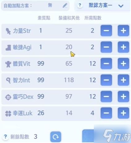 2、具体的加点,智力、灵巧、体质加满即可,多余的点数分配到幸运上。
