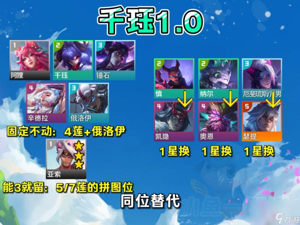 千珏到3星:速拉人口上5莲华,第5个莲华可以是3星亚索/1-2星厄斐琉斯/1星瑟提/莲华转奥恩,奥恩来纳尔直接走,凯隐来慎直接走