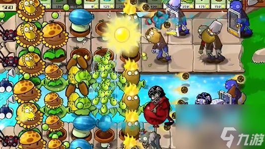3、然后在左侧补充第二列向日葵,在第五列种植一列火炬坚果,在泳池中补充玉米卷香蒲和豌豆荚许愿池。
