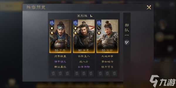 张郃自带战法具有“破甲”效果,搭配上【势如破竹】的会心,能带来巨大的伤害提升。于禁施加的“缴械”也让张郃伤害更高,徐晃辅助施加“技穷”状态,使部队控制更强,并且三人的缘分能增加彼此伤害。