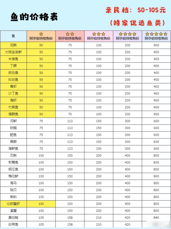 重要tips:1.花鳅、大斑金吉鲈、米诺鱼、丁鳜、欧白鱼、拟白鱼、青虾、沙丁鱼、海虾、竹荚鱼、海棘鱼、北欧鳌虾一⭐是50块的留着做菜