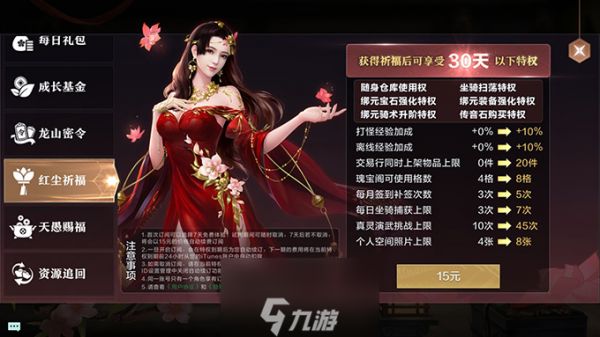 购买10元的红尘祈福季卡(30天),可享受众多特权,如图。