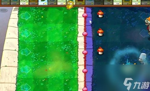 1.先在右侧种植三个火辣阳光菇和一个6号路灯。