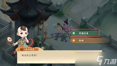 4、购买后回到闪躲的孩童那里,点击与孩童沟通,点击奇遇任务后上交购买的糖葫芦,孩童道谢后把最喜欢玩的五子棋送给我们;