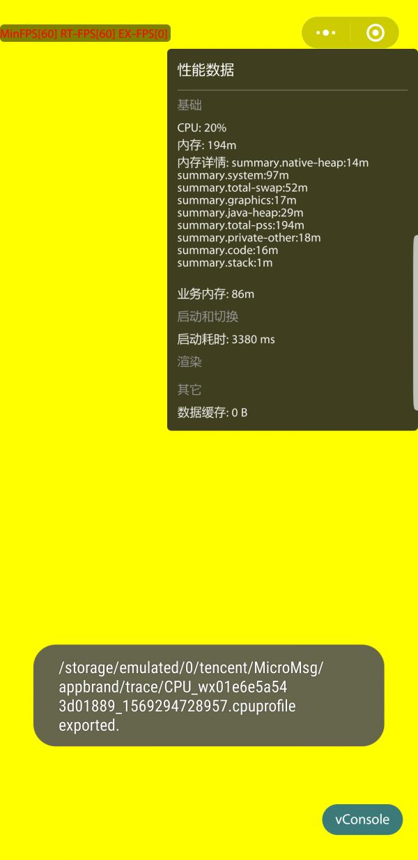 性能监控面板在微信 Android 7.0.7 版本及以上,我们在小游戏开发版和体验版提供了性能监控面板,可以通过胶囊按钮打开,效果如下图所示