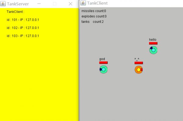 当一辆坦克死后, 服务器应该从Client集合中删除掉该客户端的信息, 从而不用向该客户端发送信息, 减轻负载.而且服务器应该开启一个新的UDP端口号用于接收坦克死亡的消息, 不然这个死亡的消息会转发给其他客户端. 所以在客户端进行TCP连接的时候要把这个就收坦克死亡信息的UDP端口号也发送给客户端. 被击败后, 弹框通知游戏结束.//服务端添加的代码片段 int deadTankUDPPort = dis.readInt();//获得死亡坦克客户端的UDP端口号 for(int i = 0; i < clients.size(); i++){//从Client集合中删除该客户端. Client c = clients.get(i); if(c.UDP_PORT == deadTankUDPPort){ clients.remove(c); } } //而客户端则在向其他客户端发送死亡消息后通知服务器把自己从客户端容器移除 for(int i = 0; i < missiles.size(); i++) { Missile m = missiles.get(i); if(m.hitTank(myTank)){ TankDeadMsg msg = new TankDeadMsg(myTank.getId());//发送坦克死亡的消息 nc.send(msg); MissileDeadMsg mmsg = new MissileDeadMsg(m.getTankId(), m.getId());//发送子弹死亡的消息, 通知产生爆炸 nc.send(mmsg); nc.sendTankDeadMsg();//告诉服务器把自己从Client集合中移除 gameOverDialog.setVisible(true);//弹窗结束游戏 } m.draw(g); } 完成这个版本后, 多人游戏时游戏性更强了, 当一个玩家死后他可以重新开启游戏再次加入战场. 但是有个小问题, 他可能会加入到击败他的坦克的阵营, 因为服务器为坦克分配的id好是递增的, 而判定坦克的阵营仅通过id的奇偶判断. 但就这个版本来说服务器端处理死亡坦克的任务算是完成了.