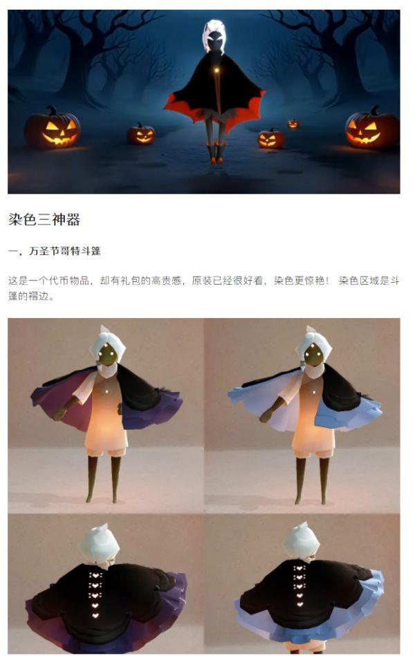 光遇迁徙季版本,有3个物品染色效果太惊艳。1个是万圣节的哥特斗篷,1个是毕业礼鹿角面具,还有1个是毕业礼鞋子。这三个物品本身就很好看,染色后更是改头换面,宛如初见。