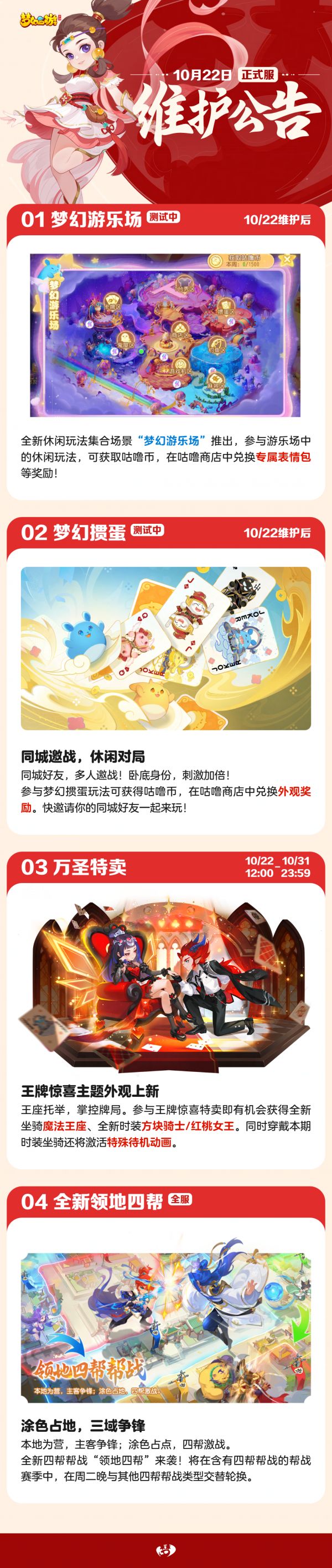 吉里吉里和咕噜咕噜用时空盒子为少侠们打造出了全新休闲玩法集合场景——“梦幻游乐场”(通过世界地图-神秘外域中进入),该场景将在部分服务器提前与大家见面。二、梦幻掼蛋 六人共游,同城邀战。同城频道将于2025年10月22日维护后在部分服务器推出全新休闲玩法——梦幻掼蛋(也可从梦幻游乐场中进入)。梦幻掼蛋在推出后可限时免费体验,无需购买牌桌即可试玩。