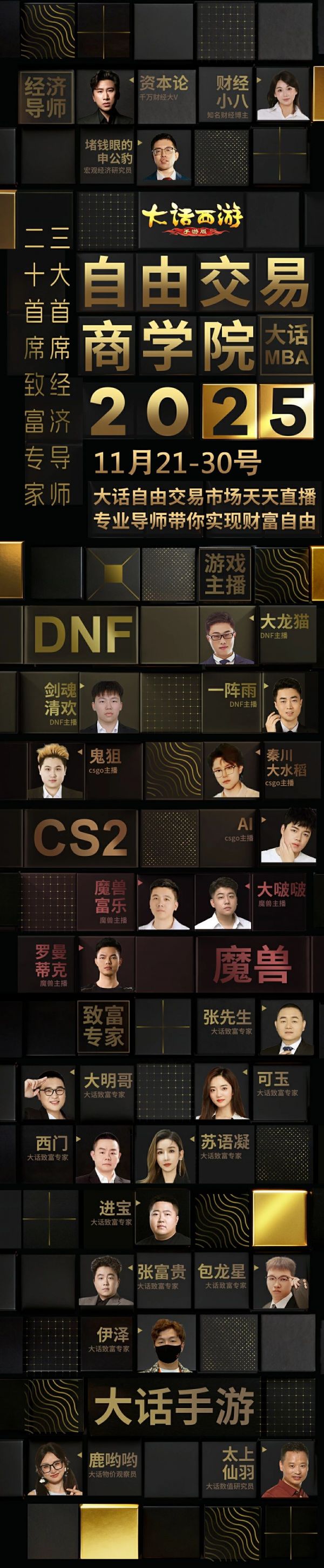自由交易服火爆开服,不止吸引了主播听泉的围观,更是邀请了一大批跨界大咖及人气玩家KOC,联合组成【大话商学院】。
