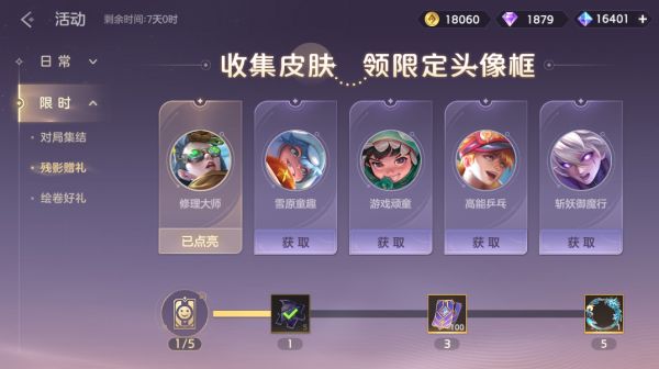 收集残影系列皮肤,根据收集进度可获得限定头像框游龙追月、礼券、皮肤碎片。