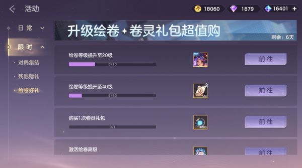 卷灵礼包限时直售,绘卷传说皮肤自选箱、龙晶、绘卷经验包、绘卷福袋、残卷等你来拿。