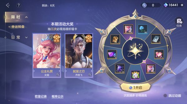 使用龙晶购买幸运币抽奖。女魃·公主礼赞、齐格飞·弑星之刃、英雄自选箱、菜就多练表情、龙魂祈福卡、皮肤碎片、好感度礼包、改名卡等奖励等你来抽!最多3抽获得龙魂祈福卡,最多6抽获得1款皮肤,最多9抽可获得全部奖励,前2抽抽到皮肤的守护者会获得欧皇称号。