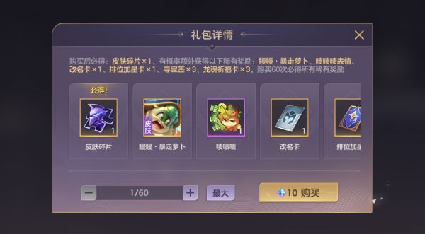 萌宠福袋限时开售,每抽必得皮肤碎片*1,概率额外获得鳗鳗·暴走萝卜、啧啧啧表情、改名卡*1、排位加星卡*1、寻宝签*3、龙魂祈福卡*3,购买60次必得所有稀有奖励。