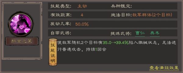 • 定位:功能型辅助主动技能,使敌军随机2目标陷入缴械(满级39.4%概率),无法普通攻击,持续1回合,主打群体普攻限制。
