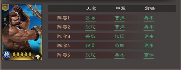 2. 张辽曹操队:大营张辽+中军曹操+前锋典韦,张辽提速,曹操辅助,典韦前锋抗伤输出。