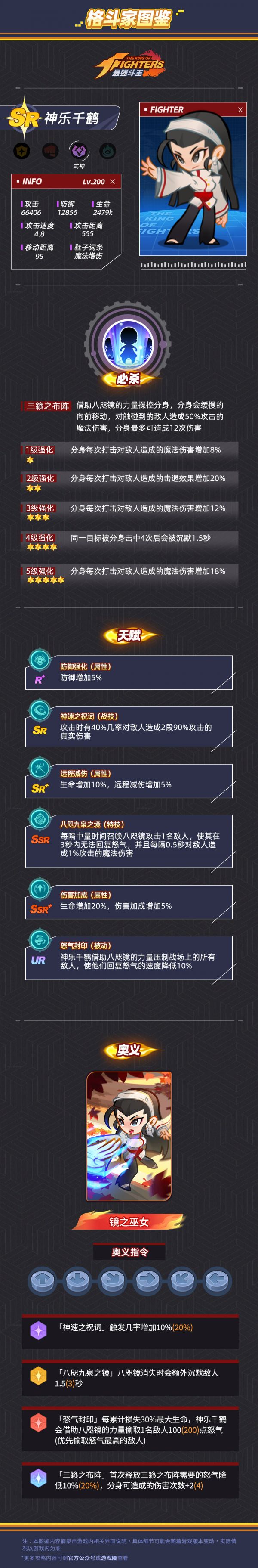 神乐千鹤是三神器家族神乐家传人,持八咫镜,肩负守护大蛇封印之责。姐姐神乐万龟遭八杰集杀害,她扛起重任,召集草薙京、八神庵组成三神器队,合力封印复活的大蛇,维系人间安宁。
