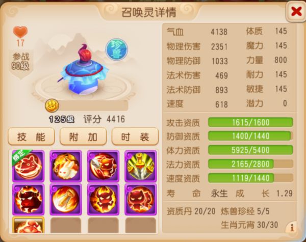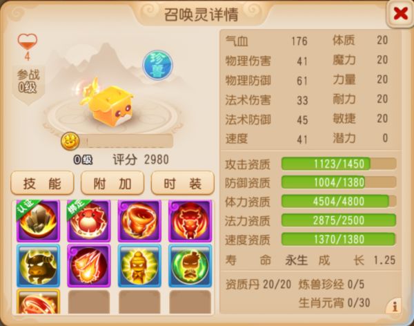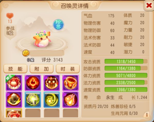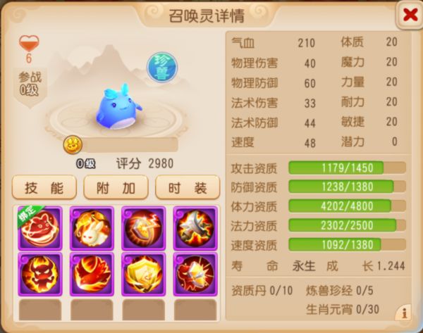 拥有高达5071的体力资质与1164的防御资质,这只吉里吉里的生存能力一定相当不错!加之高达1.244的成长与2338的法力资质,以及“牺牲”“水无常形”两大高伤强力特殊技能,待到全红之时,定是它闪耀赛场之日!