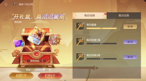 完成任务获取好运钥匙,即可开启宝箱获得奖励,洽洽薯条礼包、新品限定表情熊抱等你来抽,最多30次必得限定表情!还有龙魂祈福卡、皮肤碎片、英雄碎片等更多好礼哟~