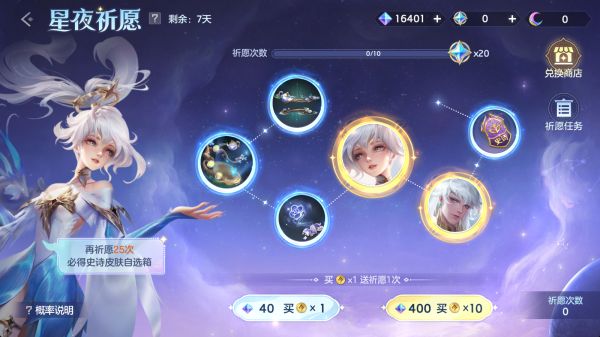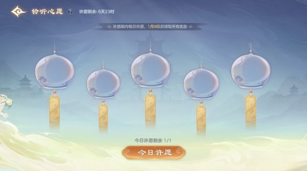 许愿期间每日登录可许1次愿望(最多5个)。愿望奖励包含礼券、龙魂祈福卡、皮肤碎片、寻宝签、皮肤8折龙晶折扣券、英雄6折金币折扣券等。