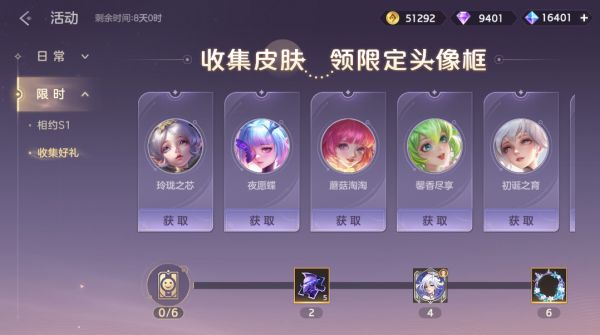 收集艾璐妮系列皮肤,根据收集进度可获得新品限定动态头像框花间游、新品限定动态头像云端龙姬、皮肤碎片。