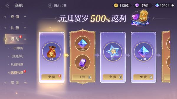 按顺序解锁礼包,可获得传说限定皮肤自选箱、元旦福袋、皮肤6折龙晶折扣券、龙晶、皮肤碎片、龙魂祈福卡等多种奖励,累计可享500%返利!
