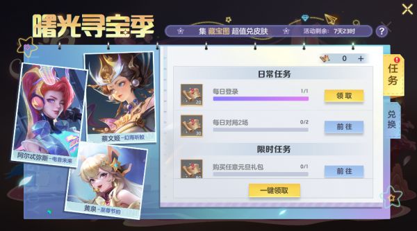 喜迎元旦,曙光寻宝季活动启动!参与活动或通过商城获取藏宝图,即可兑换传说皮肤阿尔忒弥斯·电音未来、蔡文姬·幻海听鲛、黄泉·至尊节拍,还有孙悟空·斗战胜佛、陆逊·青衫烟雨客、艾璐妮·玲珑之芯等更多皮肤,爆竹声声头像框、龙魂祈福卡、皮肤碎片、排位守护卡等丰富好礼。