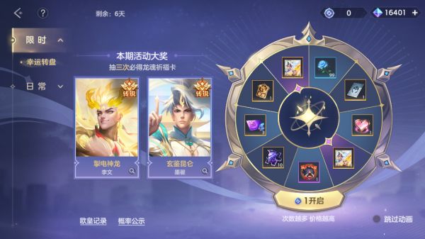使用龙晶购买幸运币,进行抽奖。李文·掣电神龙、墨翟·玄鉴昆仑、英雄自选箱、做个人吧表情、龙魂祈福卡、皮肤碎片、好感度礼包、改名卡等奖励等你来抽!最多3抽获得龙魂祈福卡,最多6抽获得1款皮肤,最多9抽获得全部奖励,前2抽抽到皮肤的守护者会获得欧皇称号。