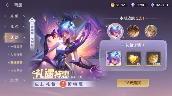 礼遇皮肤礼包限时1折,艾璐妮·夜愿蝶、鳗鳗·玩具大亨、西施·人偶新娘超值3选1。