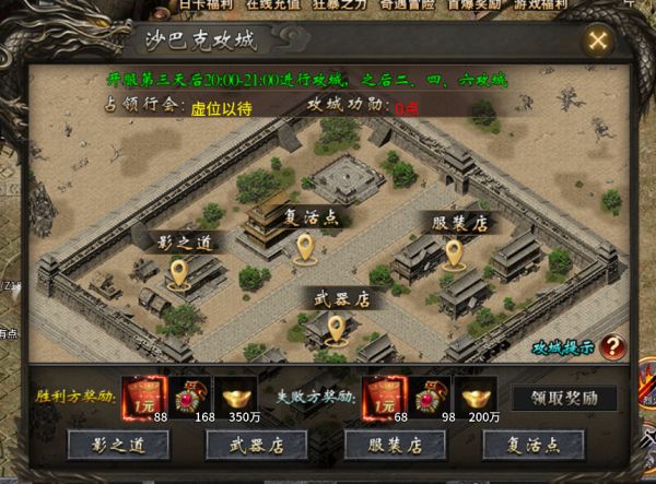 开服第3天后20:00-21:00将开启沙城争霸活动,此后每周二、四、六20:00开启;