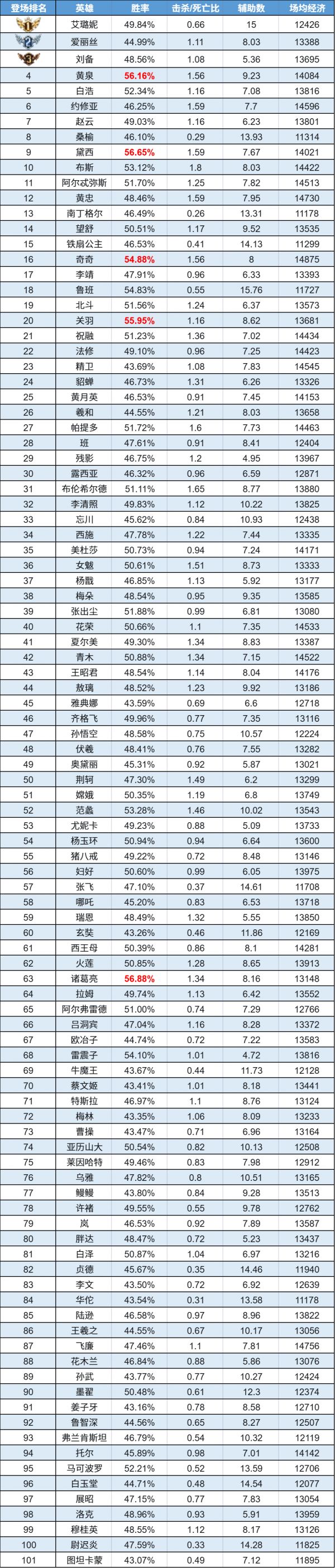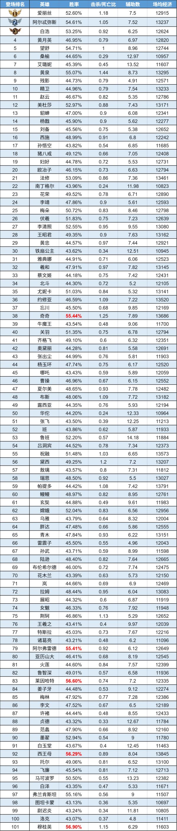 排序:按登场率高低排序,标红为胜率前5
