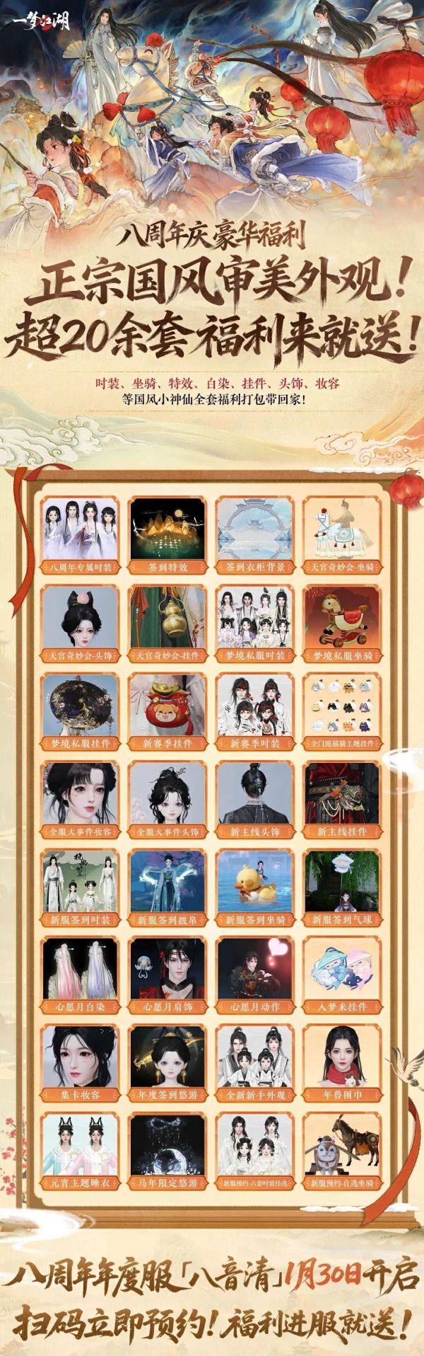 八周年资料片「照梦归」即将于1月30日欢庆来袭!下载八周年年度服,时装、坐骑、特效、白染、挂件等豪华福利打包带回家~