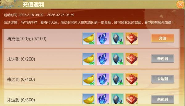 活动期间内,将开启充值返利活动,累计充值达一定档次,可获得元宝、玄晶和魂石奖励,更有潜能道具袋、技能道具袋和限时头像框等待大侠领取。