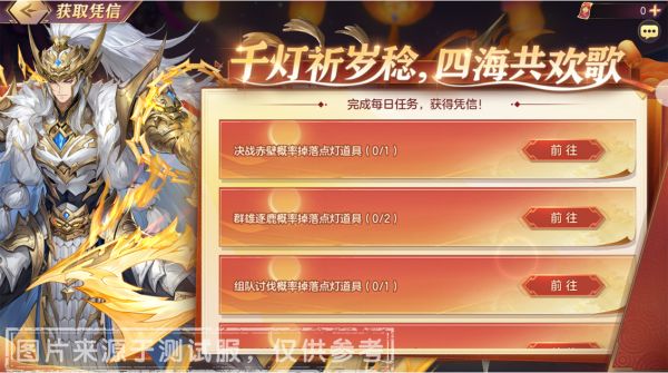 ​活动期间,通过活动页面-【获取凭信】进入任务界面!完成每日活跃任务获取点灯道具「禧灯帖」。