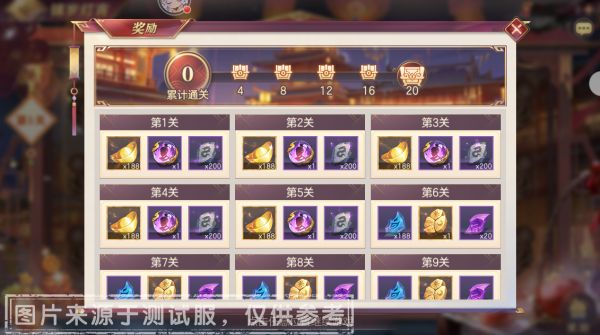 点击右下角【奖励】按钮,可查看奖励内容。本期活动共计20关,每完成一关可获得对应关卡奖励,内容包含:元宝、「灵魂纹石」、「装备赋魂任选」、「命魂石任选二选一」、「名将将魂任选」等。累计通关一定数量关卡还可获得大量元宝、「无双助力精选箱」、「龙魂将魂六选一」、「命魂石任选三选一」等奖励!