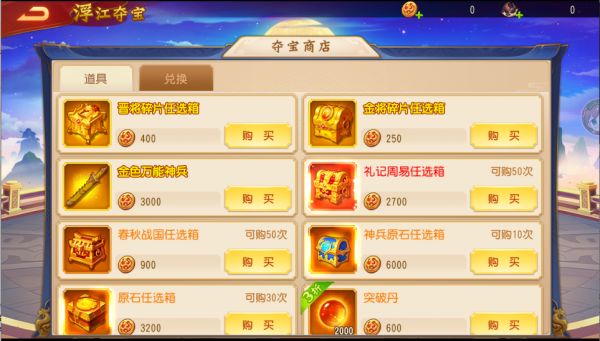 主公获得的「千斛币」可以在夺宝商店中兑换珍稀道具和海量资源,晋将碎片任选箱、金将碎片任选箱、金色万能神兵、神兵原石任选箱、礼记周易等,任主公挑选呀~