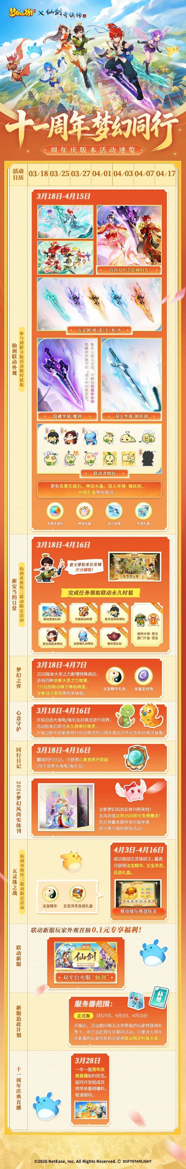1心1意,御剑同行!《梦幻西游》手游11周年庆暨《仙剑奇侠传三》联动系列活动现已惊喜上线。本次庆典玩法丰富、福利满满,为了让各位少侠能够轻松掌握所有重点,灵儿特意为大家准备了详尽的活动日历,一图在手, 重要节点不落下! 赶快长按保存吧~