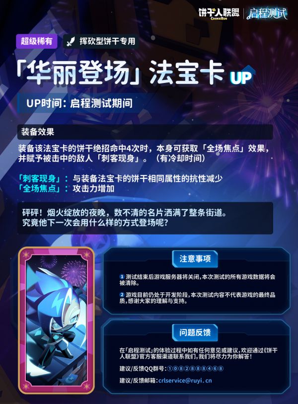 装备效果:装备该法宝卡的饼干绝招命中4次时,本身可获取「全场焦点」效果,并赋予被击中的敌人「刺客现身」。(有冷却时间)