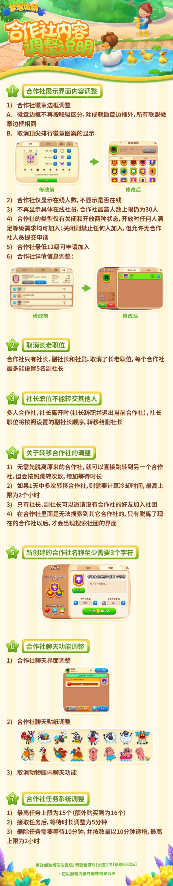 以为下【梦想城镇】游戏内“合作社”相关内容调整具体说明,本次调整内容较多请大家了解并知悉、此调整内容将在下个版本中上线!